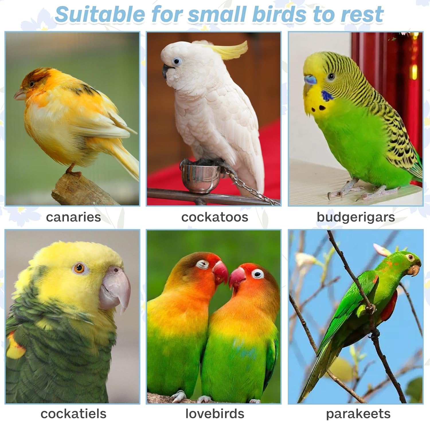 - lnteractive Exercise Toys: Designed for small sized parrots like Cockatiels, Conure, Budgies, Parakeet, and lovebirds, these bird cage perch encourage active play and exercise. Your feathered friends will enjoy hopping and balancing on the platform