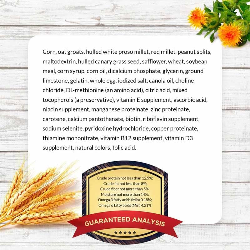 - Balanced omega 3 and 6 fatty acids to promote skin and feather health