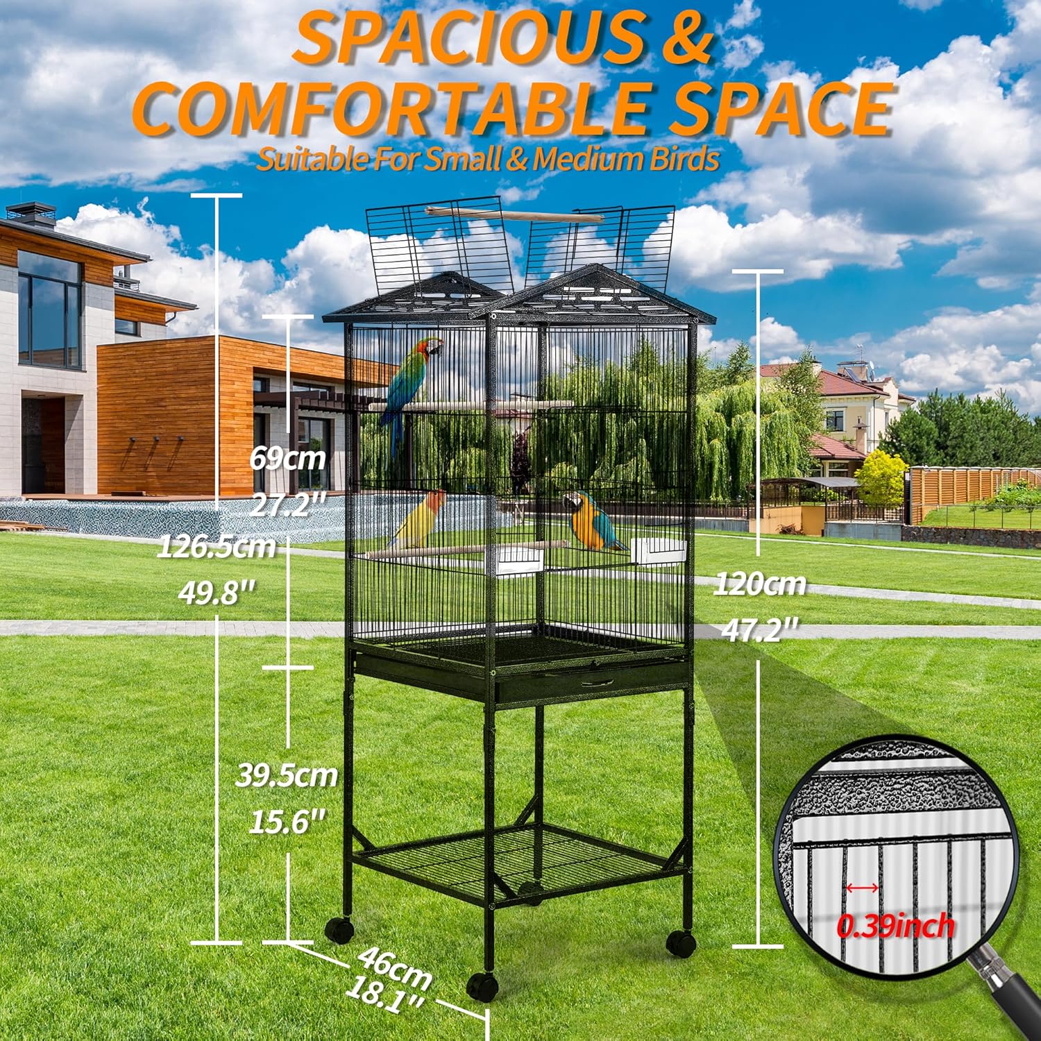 - Ideal For Small/Medium Birds:With 0.39 inch bar spacing and the dimensions of 18"×18"×47''(L×W×H),which can easily accommodate small/medium size birds like budgerigars, parakeets, parrots, cockatiels, lovebirds, etc.We provide good pre-sales and after-sales services,If you need any help,please get in touch with us at any time,we will handle it within 24h.