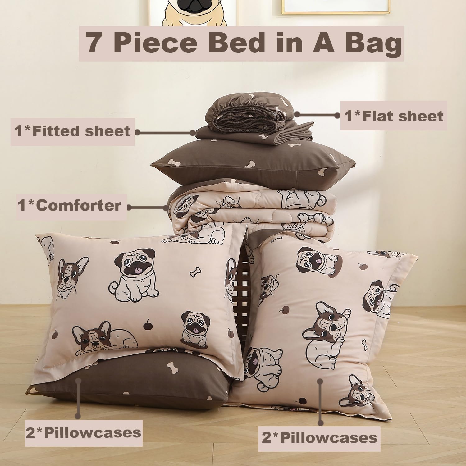 Kids Comforter Set 7 Piece Bedding Cute Dog Cartoon Animal Bed Microfiber Comforter Full Size All Season (1 Comforter, 1 Flat Sheet, 1 Fitted Sheet, 4 Pillowcase)